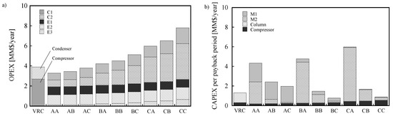 Figure 6 shows the calculated values of OPEX and CAPEX per payback period. OPEX also showed similar trend to that of the energy consumption (Figure 4) and CO2 emissions (Figure 5) because both OPEX and CO2 emissions are closely related to energy consumption. Low OPEX was observed for the membrane combinations with a high separation factor, such as AA and AB. Conversely, a completely different trend was observed for CAPEX compared to the CO2 emissions and OPEX. The CAPEX of AA and AB were higher than those of VRC. AA and AB have membranes with low permeance, which require large membrane areas that result in high CAPEX. The prices of the heat exchangers (E1, E2, and E3) were negligible, and hence, were not included in the graph. BC and CC used membranes with high permeance, which require small membrane areas, and result in low capital costs for M1 and M2. This trend is caused by the trade-off relationship between the separation factor and the permeance of the membrane, as described in the introduction. In other words, when the membrane with a high separation factor is used, the energy consumption is small, and consequently, OPEX is also small. On the other hand, when the membrane with high permeance is used, the required membrane area becomes small, resulting in less CAPEX.