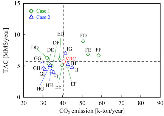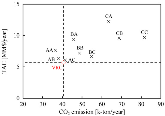 Because OPEX and CAPEX show different trends, TAC, which was calculated using Equation (1), was plotted against CO2 emissions (Figure 7) for further evaluations. When the membrane with a high separation factor was used for M1 (e.g., AA, AB, and AC), the TAC was small. Similarly, when the membrane with a high permeance was used for M2 (e.g., AC, BC, and CC), the TAC was small. This can be attributed to the contribution of both OPEX and CAPEX to TAC. More importantly, the separation performances of the preferred membrane for M1 and M2 are different in the membrane separation process to reduce TAC. Overall, AC exhibited the lowest TAC among all cases of the membrane-separation processes. However, even the TAC of AC was still higher than that of VRC. Although the TAC of AA and AB were higher than that of VRC, the CO2 emissions of AA and AB were smaller than those of VRC.