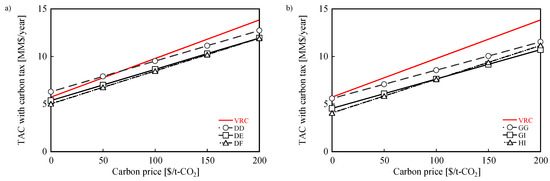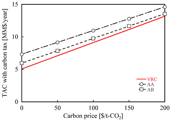 From an environmental point of view, AA and AB, of which the CO2 emissions were smaller, may be desirable even if their TACs are higher than those of VRC. A small amount of CO2 emissions can be an advantage in terms of production cost specially when the carbon tax is implemented. To further evaluate this, a factor comprising TAC with the carbon tax, which is expected to be universally implemented in the near future, was estimated based on the CO2 emissions and carbon price. Various organizations established recommendations based on the carbon price; for example, for 2050, the International Monetary Fund has suggested a carbon price between 40 and 150 $/t-CO2 (depending on the country) [45]. In this study, a carbon price range of 0 to 200 $/t-CO2 was used.