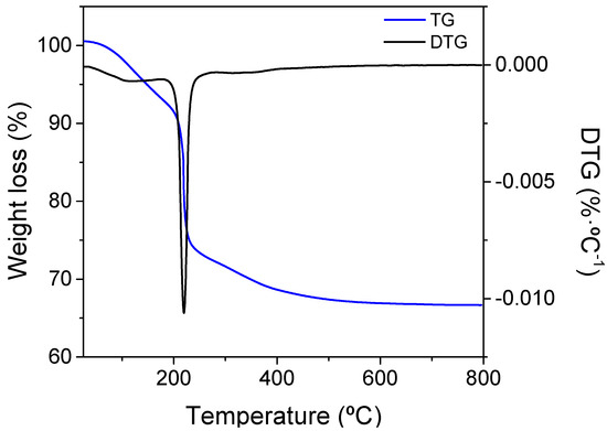The formation of the oxide was investigated by monitoring the thermal behavior of the precursors by thermogravimetry. Figure 1 shows DTA/TG curves of the CeEr10 precursor. No clear thermal events corresponding to crystallization processes were identified on the DTA curves. TG curves indicated that the decomposition of CeEr10 precursors into oxides mainly occurred below 400 °C, with a total weight loss of 33%. The Ce3+ cations in the nitrates are oxidized to Ce4+ during heating, evolving nitrogen oxides. The thermal decomposition of precursors occurs in two steps, (i) the partial decomposition of the ammonium rare-earth carbonates into oxycarbonates and (ii) the decomposition of oxycarbonates into oxides. Therefore, calcination at 800 °C ensures that there will not remain any phase related to the precursor salts, and all the nitrates and (hydroxy)-carbonates disappear completely at this temperature.