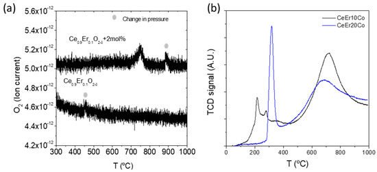 Redox properties of the CeEr10, CeEr10 + Co, and CeEr20 + Co were tested by temperature-programmed desorption and reduction (TPD and TPR), plotted in Figure 3a,b, respectively. The oxygen TPD analysis depicted in Figure 3a shows that only the desorption profile characteristic of Co appears at 760 °C in an inert atmosphere [26,27]. The two small peaks marked in the plot were identified as pressure changes inside the mass spectrometer. The very low reduction will be achieved in inert atmospheres as Ar or N2, usually employed as a sweep gas in separation membranes, and the oxygen vacancies are mainly the extrinsic ones provided by the erbium dopant. The TPR profiles (Figure 3b) show several reduction features. The peak at higher temperature corresponds to bulk ceria, indicating that it is only reduced after 400 °C, reaching the maximum reaction rate at 720 and 685 °C for CeEr10 + Co and CeEr20 + Co, respectively. The hydrogen consumption observed for CeEr10 + Co is 14.6 mL·g−1, and 10.8 mL·g−1. This difference was due to the higher amount of reducible ceria in the first material. The percentage of reduction in the cerium dioxide, nevertheless, will also be affected by the particle dispersion and size and the interaction with CoOx and Er2O3 particles. The reduction peaks at lower temperatures correspond to surface Co oxides following a two-step reduction, namely from Co3O4 to CoO and then to metallic Co [28]. The differences in Co reduction pattern are attributed to differences in particle size and distribution of Co, [29] as well as in the erbium content and Er2O3 in the interstitials. It was shown previously for Ce1−xTbxO2-δ (x = 0.1, 0.2) + 2 mol%Co that higher ceria content shifts down the reduction temperature of Co as for the present study [26].