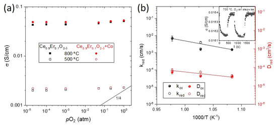 Changes in the nonstoichiometry δ are related to changes in the carrier concentration that influence the total conductivity (σ). This variation can be measured by the electrical conductivity relaxation technique (ECR). After an abrupt change of the oxygen partial pressure, it is possible to estimate the chemical diffusion coefficient (D), which characterizes the diffusion kinetics of composition changes and the surface exchange coefficient (k) by fitting the transient to Cranck’s equation [26]. The D and the k of the CeEr10 + Co_1300 were determined by conductivity relaxation curves when changing from pure O2 to air atmospheres, and vice versa, at different temperatures, as explained elsewhere [26]. The change in conductivity is very small, as it corresponds to the prevailing ionic character of trivalent doped ceria (the case of Er), and the jump is attributed to the minor electronic contribution promoted by Co incorporation. Note that this electronic contribution was not possible to be unambiguously characterized by the total conductivity measurements, but the small change in conductivity when changing from O2-air proves the contribution of the electronic carriers. The obtained values of k range from 0.2 to 7.1 × 10−3 cm/s and D from 0.8 to 6.8 × 10−5 cm/s from 600 to 750 °C. These very high values are in the same range to those reported for other doped cerias [26,30]. Both diffusion and surface exchange processes are thermally activated, as can be seen from their Arrhenius behavior shown in Figure 4b, and the activation energies Ea are 2.2 and 0.75 eV for k and D, respectively. The high Ea of the surface exchange coefficient (k) corresponds to half of the electronic bandgap of ceria (Eg CeO2 = 5.5 eV) and previously associated with the fact that the rate-limiting step for oxygen surface exchange is the availability of free electronic species required for charge transfer, [31] as expected from the low concentration of electronic carriers, barely limited to the contribution of Co (impregnated at 2 mol%). Saying that a way of improving the performance as a membrane or electrode of this material would be the formation of a composite with an electronic (or mixed) conductor to provide the electronic carriers. It has been successfully shown for other doped ceria, such as CeTb, which even performing lower levels of total conductivity, could form a stable composite with NiFe2O4 spinel and achieve high levels of oxygen permeation even in harsh atmospheres (containing SO2 and CO2) [26,32].