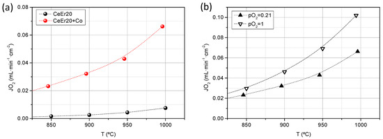 The influence of the O2 gradient through the membrane was evaluated by pure O2 as feed for the CeEr20 + Co sample. As it is observed in Figure 5b, O2 flux increases with the pO2 in the feed, i.e., pO2 gradient across the membrane, as it is postulated by the Wagner equation [34,35].