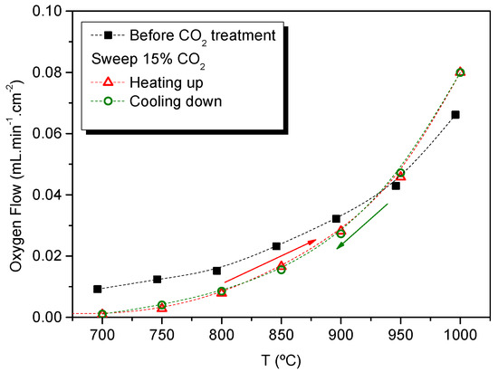 Oxygen permeation flux as a function of the temperature for a CeEr20 + Co sample before CO2 stability treatment, and after sweeping 15% CO2 in Ar at 750 °C for 24 h heating up from 650 °C to 1000 °C and cooling down from 1000 °C to 650 °C, maintaining CO2 in the sweep gas.