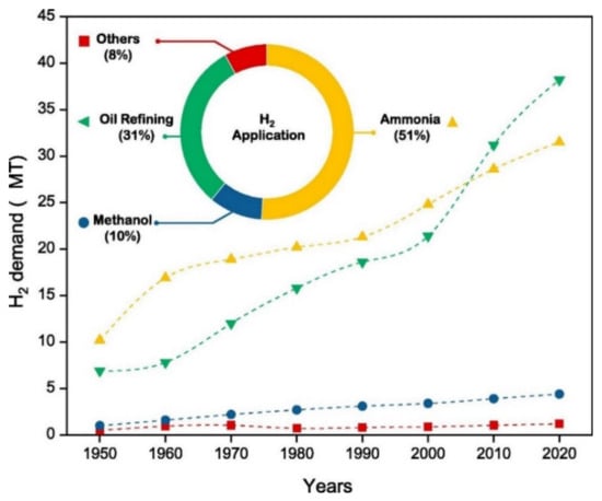 Demand of hydrogen worldwide and its share on various uses [35]. Reproduced with permission from Elsevier, 2022.