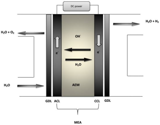 Diagram of an AEM water electrolysis. CCL: cathode catalyst layer, ACL: anode catalyst layer, GDL: gas diffusion layer, and MEA: membrane electrode assembly [56]. Reproduced with permission from Elsevier, 2022.