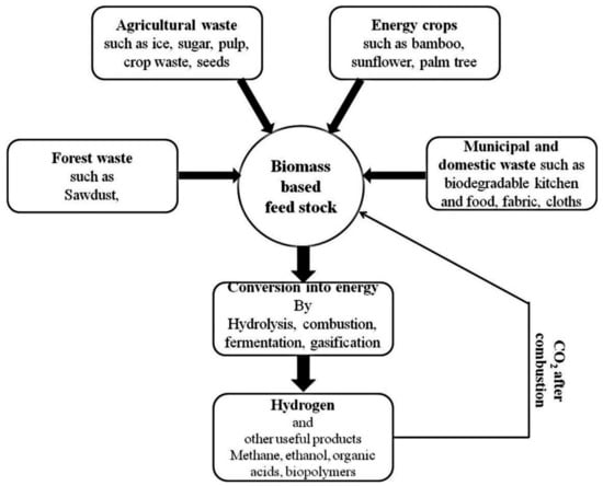 Sources of biomass and their conversion into hydrogen and other beneficial products [72]. Reproduced with permission from Elsevier, 2022.