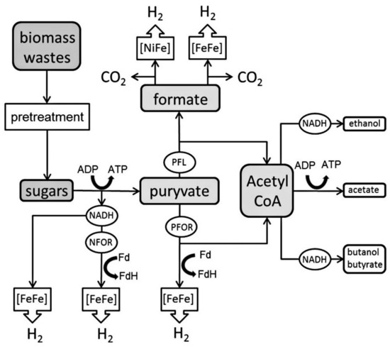 Dark fermentation (DF) is seen as the most promising technique for the generation of biohydrogen via the conversion of biomass, it has a net energy ratio equivalent to 1.9, while that of steam methane reforming is equal to 0.64 [75]. Production of hydrogen can be done by anaerobic bacteria, which are grown in carbohydrate rich or dark substrate. The anaerobic metabolism of pyruvate, which is formed due to the catabolism of various substrates, drives most microbial hydrogen production. One of two enzyme systems catalyze pyruvate breakdown [75]:
