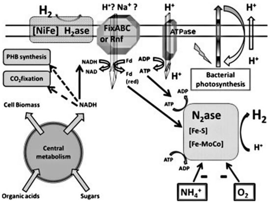 Photo fermentation is considered as one of the probable pathways for the production of biological hydrogen. Anoxygenic photosynthetic bacteria, especially the purple non-sulfur (PNS) bacteria, are in this process able to reduce H+ ions to gaseous H2, through the use of both the reduction power obtained from the organic compounds’ oxidation, e.g., low-molecular weight fatty acids as well as light energy. This mechanism is regarded as promising as a result of the absence of O2-evolving reactions, the potential to utilize varied range of sunlight, high substrate conversion yields, and the potential to combine this form of H2 production methods with waste disposal [77].