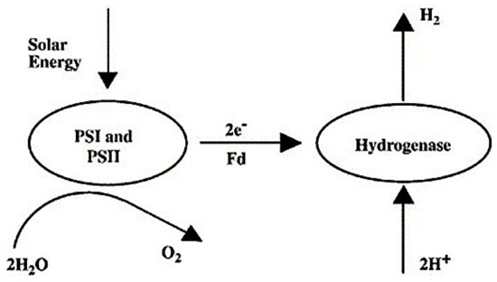 The most analyzed species for direct bio-photolysis is the microalgae chlamydomonas reinhardtii. Both photosystems (PSI and PSII) and hydrogenase enzymes play active roles in direct bio-photolysis [82]. The molecules of water are split by green algae in direct bio-photolysis to form oxygen and hydrogen ion via photosynthesis. H2 is produced through the conversion of the generated hydrogen ions by hydrogenase enzyme. This enzyme is extremely sensitive to oxygen, and as a result, the oxygen content must be maintained below 0.1%, which is a drawback of this technology [83]. The process of direct bio-photolysis is presented Figure 9.