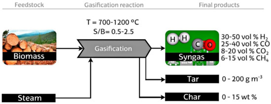 Biomass gasification is regarded as a potential way of RE hydrogen production. Biomass gasification is identified as the most economical and efficient way for the production of hydrogen. It is a high temperature partial oxidation process where biomass, which is a solid carbonaceous feedstock, is transformed into a gaseous mixture (CH4, CO2, H2, CO, tar, light hydrocarbons, ash, minor contaminates, and char) using gasifying agents [89]. Biomass gasification’s performance is affected by at least 20 operational parameters regarding the feedstock and gasifier, which include the gasifier’s geometrical configuration, flow rate, type of gasifying agent, reaction/residence time, pressure and temperature of the gasification, the gasifying agent/biomass ratios, etc. [89,90]. The product distribution and the composition of gas hinges on several factors, which include the reactor type and the temperature of the gasification. The most vital gasifier types are the entrained flow gasifier and the fixed bed gasifier (updraft or downdraft fixed beds). A significant gas conditioning needs to be included in these gasifiers along with inorganic and tars impurities removal and the subsequent transformation of CO to H2 through WGS [91].