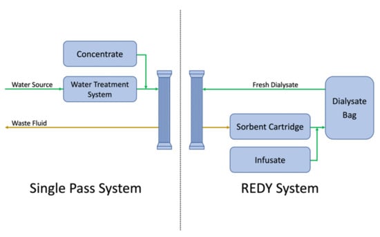 During dialysis, dialysate and blood pass through artificial kidneys in a counter current pattern. When dialysate leaves the artificial kidney, multiple uremic toxins and excessive fluid from the blood compartment are withdrawn with dialysate. In a conventional single pass dialysis, the waste fluid is usually abandoned directly. Compared to single pass dialysis, the REDY system recirculates the waste fluid to an exchangeable sorbent cartridge to remove excessive solutes and regenerate dialysate (Figure 2). The sorbent cartridge contains materials such as charcoal, urease, or zirconium phosphate to eliminate the substance through chemical break down, ion exchange, or adsorptions [92]. The dialysate regeneration reduces the water requirement from 120 to 6 L per treatment [92,93].