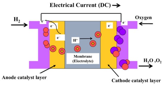 A PEMFC consists of electrodes, an electrolyte, a catalyst, and diffusion layers. Figure 1 depicts a diagram of a PEMFC [18]. The membrane and the catalyst layers create the membrane electrode assembly. The PEM serves a vital role, as it is responsible for separating the gaseous reactants, conducting protons, and electrically insulating the electrons. Membranes ideal for PEMFCs should be of low cost and possess desirable properties such as high proton conductivity, high mechanical strength, high thermal, chemical, and electrochemical stability, and low oxygen and fuel crossover. In that regard, perfluorosulfonic acid (PFSA) membrane, i.e., Nafion of Dupont, is most commonly in PEMFCs, due to its superb chemical stability, outstanding strength, and high ionic conductivity [20,21]. Nevertheless, the conductivity of the membrane decreases significantly when the temperature exceeds 100 °C, rendering it undesirable for high-temperature processes.