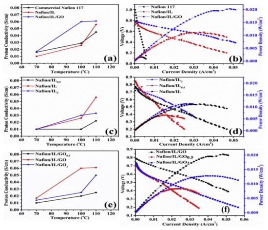 The addition of silica (SiO2) showed an improvement in membranes along with ILs. For example, for Nafion/(SiO2)3.67(TEA)/(TEA-TF)1.2, a conductivity of 4.7 mS/cm was reported at 105 °C [79]. Another example is the Nafion/1-(3-hydroxypropyl)-3-methylimidazolium tetrafluoroborid [C3OHMIM]BF4/SiO2 (50/10 wt%) membrane, which was found to be stable up to a temperature of 405 °C due to the formation of hydrogen bonds. Moreover, the membrane achieved a conductivity of 55 mS/cm above 160 °C and a 100% increase in the tensile strength compared to pristine Nafion [80]. In another study, the protic IL1-(3-trimethoxysilylpropyl)-2-methylimidazolium tetrafluoroborate [TMSPMIM]BF4 was employed to functionalize mesoporous SiO2 in order to prevent IL retention. The resulting Nafion membrane showed a 7-fold increase in conductivity when 3 wt% functionalized SiO2 were utilized, where a conductivity of 375 mS/cm was obtained [81]. The use of graphene oxide (GO) to enhance the conductivity of Nafion-based membranes, especially at higher temperatures, has been investigated. Maiti et al. [82] synthesized a membrane using GO, [DMBIM]H2PO4, and Nafion 117. At 110 °C, the conductivity was 6.1 mS/cm. Figure 4 shows the influence of temperature on the proton conductivity of the membranes, as well as the effect of the current density on the voltage and power density of the PEMFC operating with hydrogen at 110 °C. The figure shows an enhancement in conductivity and fuel-cell performance (as seen by the polarization curve) upon the modification of Nafion using ILs or additives (e.g., GO).
