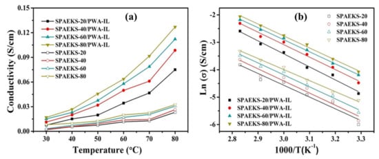 Zhang et al. [121] synthesized a hybrid membrane by incorporating 1-butyl-3-methylimidazolium bis(trifluoromethanesulfonyl)imide [BMIm][TFSI] IL with silicon nanorods (SNR) into poly(2,5-benzimidazole) (ABPBI) polymer. The conductivity was 10 mS/cm under a temperature range of 80–140 °C. The PEMFC performance attained power densities of 150 and 280 mW/cm2 at 80 and 180 °C, respectively. Li et al. [122] synthesized composite membranes using sulfonated poly(arylene ether ketone sulfone) (SPAEKS) and 1-ethyl-3-methyl imidazolium phosphotungstate (PWA-IL). At 80 °C, the PEM showed an excellent proton conductivity of 127 mS/cm. Figure 5 shows the variation of the temperature on the conductivity of SPAEKS-based membranes, in addition to the Arrhenius plot. Awasthi et al. [123] synthesized a hybrid membrane based on poly(arylene ether) polymer while incorporating [BMIm][BF4] IL. The hydrophilic length was constant at 8 kDa, while the hydrophobic length was varied (5, 8, and 10 kDa) to produce the polymers (named as P1, P2, and P3 polymers, respectively). The increase in the hydrophobic length resulted in a decline in the proton conductivity of the membrane owing to lower water retention. Moreover, the IL improved the conductivity. For instance, the proton conductivity of P1 increased from 32 to 75 mS/cm when 50 wt.% of IL was added to the PEM. Following the trend, the proton conductivity of P2 rose from 25 to 61 mS/cm and the proton conductivity of P3 increased by 109% with the addition of 50 wt.% [BMIm][BF4].