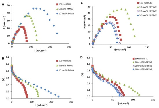 (A,C) Power curves and (B,D) polarization curves for PEMFC membranes based on poly(IL-co-hPFSVE), poly([IL-co-MMA), and poly(IL) [141]. Reproduced with permission from Elsevier, 2019.