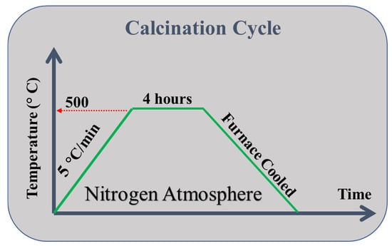 Calcination cycle explaining calcination of dried powder at 500 °C for 4 h under nitrogen atmosphere.