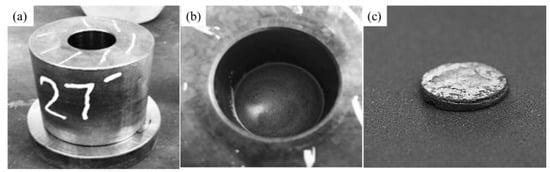 (a) Stainless-steel die of 27 mm diameter; (b) powder mixture within the die; (c) membrane synthesized via compaction process.