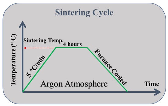 MWCNTs impregnated with Ag nanoparticles were uniaxially compressed in a stainless-steel die with a diameter of 27 mm at two different pressures, 80 MPa and 120 MPa, as illustrated in Figure 2a,b. This resulted in membranes of approximately 27 mm diameter and 2.5–3 mm thickness, as shown in Figure 2c, having 1 wt% Ag loading. To prevent the oxidation of the MWCNTs, these membranes were sintered for 4 h in a horizontal sintering tube furnace at two different temperatures, 800 °C and 900 °C, with a heating rate of 5 °C/min in an argon atmosphere. Figure 3 depicts the sintering process.