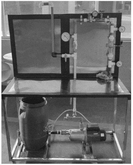 The dry weight of the membrane sample was determined using a density balance, and the wet weight was determined by soaking it in distilled water. The experiment was carried out five times, with the average value utilized to minimize the experimental error. The water movement across the membrane generally relies on the porosity of the membrane sample, with a higher water permeability for the membranes having higher porosity. On the flow loop test bench depicted in Figure 4, water flux measurements were taken.