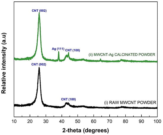 Figure 9i shows the XRD pattern of raw MWCNTs, which shows two prominent distinctive peaks at 2θ∼25 and 44 degrees, which correlate to the hexagonal graphite lattice of MWCNTs. For MWCNTs-Ag, peaks of Ag were detected at 2θ∼38°, as shown in Figure 9ii. After the calcination of MWCNT-Ag powder, crystals of Ag were formed, which were detected in XRD peaks.