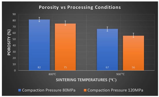 Porosity was found to decrease as the initial compaction load and sintering temperature increased. A maximum porosity of 82% was achieved in the sample prepared at 800 °C with a compaction load of 80 MPa. A minimum porosity of 56% was achieved in the sample prepared at 900 °C with a compaction load of 120 MPa (Figure 11). The effect of temperature was significant towards a better densification, primarily due to higher diffusion of Ag within the MWCNT network and wider coverage of voids present between the MWCNT network by Ag particles. Additionally, better adhesion of MWCNT-Ag-MWCNT was realized because of the higher activation energy available for bonding.
