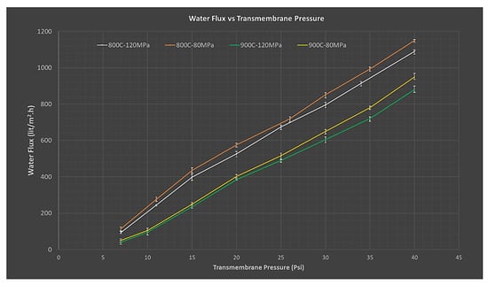 Water flux values were also influenced by the initial compaction loads and sintering temperatures. Generally, higher flux was measured in more porous membranes which were compacted with low compaction loads and sintering temperatures. A linearly increasing trend in water flux was observed in all samples with an increase in pressure across membranes (7–40 Psi), as illustrated in Figure 12. All the membranes developed through a powder metallurgical route showed overall higher flux values than the ones prepared via chemical vapor deposition, a technique described in the literature [].