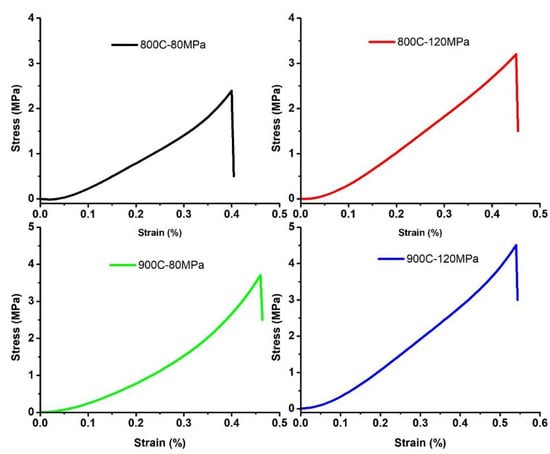 Diametrical strength was measured to have increased with the increase in initial compaction pressure and sintering temperature. The sample synthesized at 900 °C and compacted at 120 MPa achieved the highest strength of 4.5 MPa, as shown in Figure 13. The strengths observed for the current membranes were consistent with the existing literature on diametrical compression strength for Alumina/CNT-based membranes [].