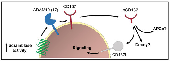 Transient exposure of PS plays an important role in the immune system. One example is the release of the TNFR family member CD137 via ADAM10 (or ADAM17). Soluble CD137 (sCD137) can bind to its ligand CD137L expressed on activated T cells and activate cell signaling. Whether sCD137 could fulfill additional functions, e.g., activation of antigen-presenting cells (APCs) or act as decoy is still not clear.