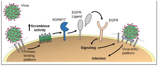 PS externalization could be of high relevance for virus entry into host cells. First, formation of the primary virus–receptor complex triggers non-apoptotic cell surface exposure of PS via scramblases. Externalized PS promotes membrane fusion and virus infection. Second, scramblase activation would lead to ADAM activation. Subsequent EGFR signaling has been identified as important step for infection with the human papillomavirus.