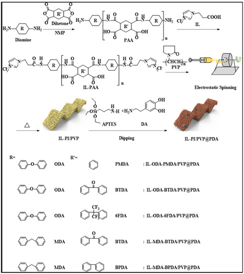 Tris (0.90 mmol = 0.12 g), DA (1.00 mmol = 0.20 g), and APTES (4.50 mmol = 1.0 g) were dissolved in ethanol/deionized aqueous solution (v/v = 1:5, 120 mL, pH 8.5) to serve as the medium of coating impregnation. After the fibrous membranes were left in the solution at room temperature for 24 h, they were washed with deionized water and dried for a further 3 h. This process resulted in the final IL-ODA-6FDA/PVP@PDA fiber membranes.