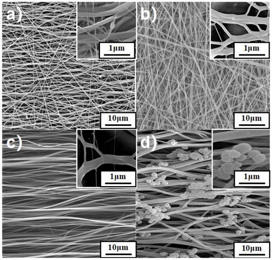 SEM images of electrostatic porous membrane: (a) ODA-6FDA, (b) IL-ODA-6FDA, (c) IL-ODA-6FDA/PVP, (d) IL-ODA-6FDA/PVP@PDA in Table 1.