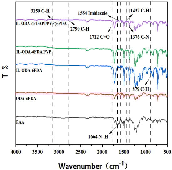 In order to verify whether the ionic liquid reacted with the polymer matrix, FTIR analysis was conducted to determine the fiber membranes’ chemical structure. In preparation, the matrix was soaked in and washed with methanol for 7 days to remove residual ionic liquid to prevent it from affecting the test results. As per Figure 3, the –NH absorption shock peak at 1664 cm−1 indicated the formation of PAA, confirming the presence of its imide group. Compared with PAA, other samples showed C=O and C–N bond stretching vibration peaks in the imide group at 1712 and 1367 cm−1, respectively, while the aforementioned –NH absorption peak was no longer observed. These prove the formation of ODA-6FDA. Additionally, the C–H stretching vibration of the imidazole cation and skeleton ring, and the vibration absorption peaks of the nearby methyl C–H bond structure could be discerned at 3150, 1554, 2790, and 879 cm−1, respectively. With the addition of PVP, in contrast to IL-ODA-6FDA, the infrared spectrum of this modified system generated peaks at 3150 and 1620 cm−1. The spectra of the IL-modified system shifted these peaks towards higher frequencies by 6.2 and 4.5 cm−1, respectively, with large deviations. It demonstrated a strong interactive force between the components and a greater extent of compatibility.