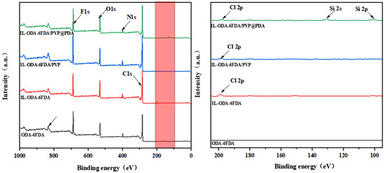 As indicated in Figure 4, F1s (687 eV), C1s (283 eV), N1s (397 eV), and O1s (531 eV) were clearly visible in the spectrum of the original ODA-6FDA. By contrast, Cl2p (198 eV) was also observed in the IL-ODA-6FDA, demonstrating that IL was grafted successfully into the ODA-6FDA chain segment. Two new characteristic peaks in IL-ODA-6FDA/PVP@PDA were observed, indicating Si2s (130 eV) and Si2p (101 eV), showing PDA and APTES were successfully coated onto IL-ODA-6FDA/PVP fibers after functionalization.
