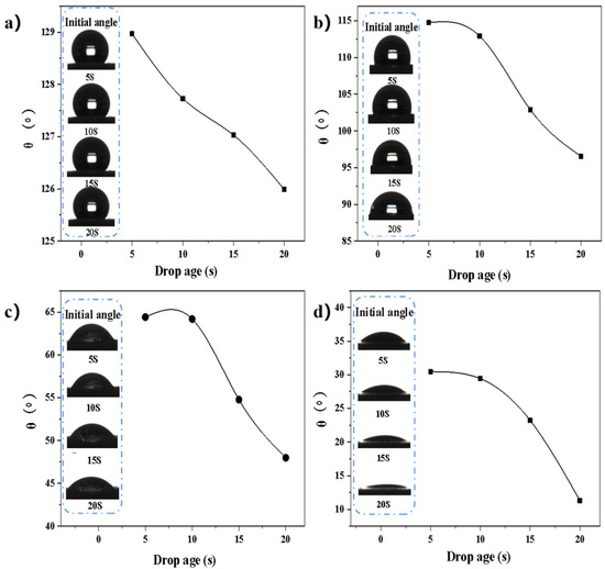 Generally speaking, membrane surface wettability is an important feature of oil/water separation performance. Here, contact angle θ tests were conducted to explore the wettability of the synthesized membranes. Experimental data showed the ODA-6FDA fiber membrane’s (θ) value to be in the range of 126–129°, which did not change significantly after 20 s, meaning this unmodified membrane was hydrophobic (Figure 5a). The IL-ODA-6FDA fiber membrane’s θ value decreased from 128.97° to 114.70° (Figure 5b) over the testing period, during which water droplets gradually penetrated through the membrane. From this, it was concluded the addition of an ionic liquid can affect the wettability of the membrane surface. Compared with the former two, the IL-ODA-6FDA/PVP fiber membrane displayed better surface wettability (Figure 5c). Its θ value likewise changed over the course of the testing period, but diminished from the lower initial 64.43° to 30.26° (Figure 5d). Finally, the ODA-6FDA membranes coated with PDA exhibited consistently excellent hydrophilicity. The decreasing trend in water contact angles in most variants indicated surface wettability of the membrane was significantly improved after the cumulative addition of ionic liquid, blending PVP, and coating PDA. Consequently, it was concluded the addition of hydrophilic groups decreased the water contact angle and significantly improved the wettability of the membrane surface.
