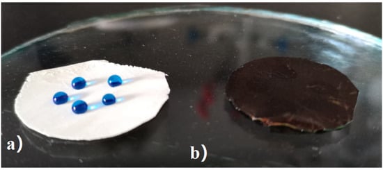 Photographs displaying droplets on the film surface (a) original ODA-6FDA in air, (b) IL-ODA-6FDA/PVP@PDA membrane in Table 2.
