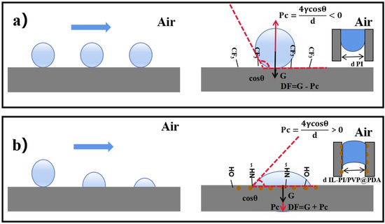 Schematic diagram of the separation principle of original and modified ODA-6FDA membranes, (a) water on the surface of the unmodified membrane in air, and (b) water on the surface of IL-PI/PVP@PDA membrane in air.