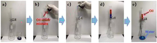 The separation process of IL-ODA-6FDA/PVP@PDA porous membrane. (a) get the device ready; (b) and (c) pour the oil-water mixture into the filter bottle; (d) oil-water mixture separation process; (e) oil and water can be completely separated by their own weight.