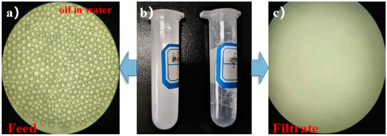 With the rapid development of oil extraction, chemical metallurgy, the textile and food industries, humanity is producing a large amount of wastewater containing a large proportion of oil and its derivatives. The means to quickly and efficiently treat oily wastewater is a matter of no little importance in current research. Traditional methods of treating oily waste [1,2] include gravity sedimentation [3,4], air flotation [5,6], separation by centrifuge [7,8], ultrasonic techniques [9], and electrochemical method [10], amongst others. However, these methods have poor separation efficiencies and high costs, yet can still easily cause secondary pollution. Due to its simple preparation, high efficiency, and broad applicability, membrane separation technology [11] has gradually attracted attention. At present, this technology is primarily used in such applications as gas separation [12], liquid separation, and ion-exchange membranes [13]. With the advancement of work on the separation membrane, this technology has now become the most effective method for treating oily wastewater [14,15].