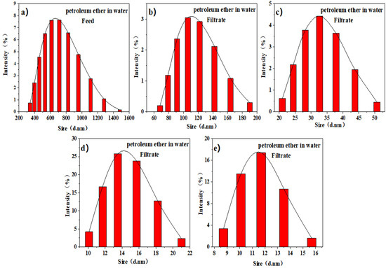 Nanoparticle size analysis of petroleum ether/water emulsion before and after PI membrane separation at different stages (a) before separation, (b) ODA-6FDA, (c) IL-ODA-6FDA, (d) IL-ODA-6FDA/PVP, and (e) IL-ODA-6FDA/PVP@PDA membrane in Table 2.