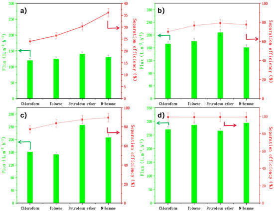For the emulsified oil-water separation performance test, the IL-ODA-6FDA/PVP@PDA membrane was assessed using four different oil-water emulsions (with toluene, n-hexane, petroleum ether, and chloroform as the hydrophobic components). For the preparation of the emulsions, their oil content before separation was 10%, each sample was of diameter 1.5 cm, the test time was 15 min, and there was a total of 20 samples. On the basis of it being conducted as a non-circulating test, each sample was tested five times. The separation test of the emulsified oils followed the same steps as that of the non-emulsified oil-water systems, i.e., sieved by the weight of the liquid. This process thus used the same apparatus as illustrated in Figure 7, with the separation effects as shown in Figure 8. The membrane flux of ODA-6FDA for the different emulsified oil of systems was maintained at 120–130 L·m−2·h−1, while the separation efficiency fell within the range of 23–36% (Figure 11a). By contrast, these respective properties of IL-ODA-6FDA were 170–200 L·m−2·h−1 and 70%. Therefore, the membrane separation efficiency was improved due to the introduction of an ionic liquid component containing short carbon chains, whose high surface energy allows water droplets to diffuse and penetrate the surface quickly.