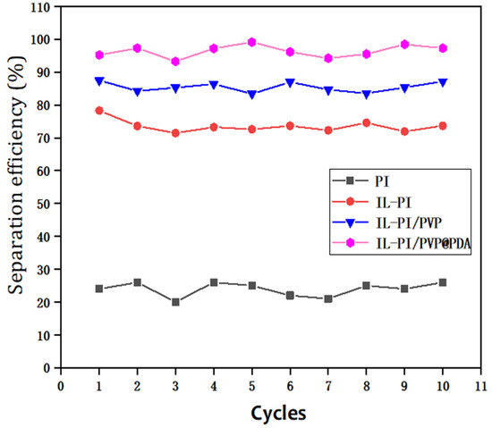 At present, industrial requirements for oil-water separating membranes must not only feature proven, high separation efficiency, but also the capacity for large-scale production, and excellent mechanical properties and cycle capabilities. The porous membranes prepared as detailed here introduce a large number of hydrophilic groups [33], while taking into account the excellent mechanical strength of PI itself. The separation flux was demonstrated to reach 290 L·m−2·h−1, with a separation efficiency exceeding 99%. Compared with other experimental membranes [33,34], the straightforward preparation of IL-ODA-6FDA/PVP@PDA and its positive test results ensure its stable water flux and high separation efficiency. This also means it meets the above requirements for separation membranes with potential industrial applications, thus affording it realistic commercial prospects.