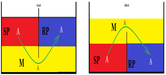 Schematic representation of membrane systems with an organic solvent: (a) denser or (b) less dense than the aqueous phases. Legend: M = membrane; SP = Source Phase; RP = Receiving Phase; A = interest chemical species for separation.