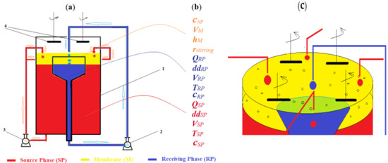The dispersion bulk liquid membrane module: (a) functional scheme: 1—the module; 2 and 3—variable flow pumps; 4—magnetic rod stirrers; (b) variable parameters: CNP—nanoparticles’ concentration; VM—membrane volume; hM—membrane height; rstirring—stirring rate; QRP—receiving phase flow; VRP –receiving phase volume; ddRP—receiving phase drops dimension; TRP—receiving phase temperature; CRP—receiving phase concentration; QSP—source phase flow; VSP—source phase volume; ddSP—source phase drops dimension; TSP—source phase temperature; cSP—source phase concentration; (c) positioning of drip holes and magnetic rods.