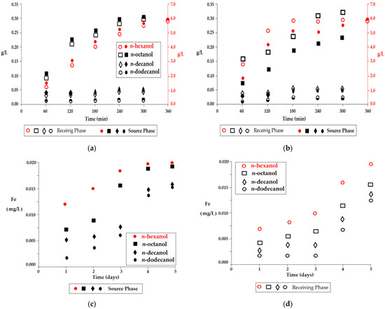 Material losses from the dispersion bulk liquid membrane: (a) n-alkyl alcohol in the aqueous phase (pH = 7 in the source phase, and pH = 1 in the receiving phase); (b) n-alkyl alcohol in aqueous phase (pH = 1 in the source phase, and pH = 11 in the receiving phase); (c) iron in the source phase; (d) iron in the receiving phase.