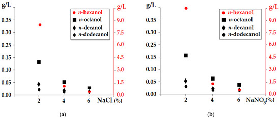 Adding salts can be an important way to stabilize the membranes based on n-alkyl alcohols (Figure 4). By operating at the maximum flow of aqueous solutions, a decrease in losses of normal alcohols from the membrane to the acid source phases was found. The influence of sodium chloride (NaCl) in the acidic aqueous solution of pH = 1 (HCl) (Figure 4a) was greater than that of sodium nitrate (NaNO3) in the acidic pH = 1 solution (HNO3) (Figure 4b). What is noteworthy is that at weight concentrations of 6% salt in the source acid phases, n-hexanol became interesting as a membrane solvent for future applications. For other alcohols, a salt weight concentration of 2–4% could ensure the stability of the membrane.