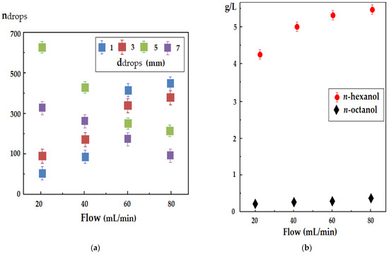 Limiting the size of the droplets made it possible to control the flow control using several drip holes, with 2–4 flexible silicone rubber tubes (Figure 2c). The study of droplet sizes according to the flow rate of the aqueous phase was carried out with the help of the system designed and presented previously [51,52]. This system consisted of a video camera connected to a computer that allowed counting of the drops, depending on the diameter imposed by the operator. The results presented in Figure 5a show that when varying the flow of the source phase from 20 to 80 mL/min, a relatively narrow distribution of most of the drops of around 4 mm was obtained. At lower flow rates (20–40 mL/min), the distribution was narrower, with most of the drops being around 4 mm in diameter. At a flow rate of 80 mL/min, the distribution flattened, which required obtaining higher flow rates by multiplying the drip holes.