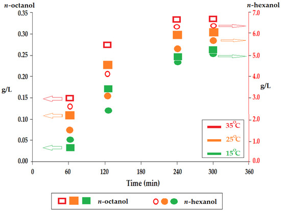 The losses depending on the temperature (Figure 6) of n-hexanol and n-octanol, which were the most soluble membrane solvents used in the source phase, were capped by their solubility at the required working temperature. At 15 °C, there were the lowest losses, but also, the adhesion to the surface of the drops could increase because the viscosity increased. From a practical point of view, the operation at 20–25 °C remains a more technically viable working option. The work effort at 15 °C is not justified, with the losses of membrane material not being able to compensate for the energy costs of cooling the system. In applying this technology, it is advisable to work at an ambient temperature, depending on the climatic zone.