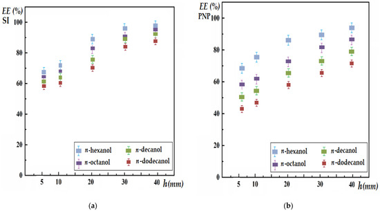 The obtained results show that for silver ions (SI), the extraction efficiency depends significantly on the nature of the alcohol and the thickness of the membrane (Figure 7a). A high membrane thickness favors the convection generated by the falling aqueous phase droplets, leading to higher extraction efficiencies for all membrane alcohols. As the thickness of the membrane decreases, the path travelled by the aqueous drop becomes smaller, and the convection that it generates has a minor contribution to the extraction efficiency. For the efficiency of p-nitrophenol (PNP) extraction (Figure 7b), the greatest influence is the nature of the alcohol, while the thickness of the membrane has a lower contribution to n-hexanol, which increases significantly for higher alcohols. Practically, in this case, the solubility of PNP in the membrane is decisive, but a greater thickness of the membrane amplifies the convection generated by the droplets. From an applicative point of view, a greater thickness of the membrane is recommended, which will force the convection and, implicitly, the extraction efficiency, but the limitation of the concomitant increase of the membrane volume must be taken into account.