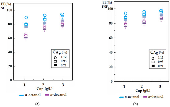 In order to observe the influence of the concentration of magnetic nanoparticles and the contribution of silver contained in them on the separation of the target chemical species, the study continued with the investigation of n-octanol and n-decanol as selected membrane solvents (Figure 8). At a rotational speed of the magnetic rods of 150 rot/min and a membrane thickness of 10 mm, the efficiency of silver extraction (Figure 8a) and p-nitrophenol extraction (Figure 8b) were determined. For both test chemical species, the increase of the nanoparticle concentration in the membrane phase but also of the silver concentration in the nanoparticle composition favored the process. At an operating time of 3 h, the data in Figure 8 show that the extraction efficiency of p-nitrophenol was superior to that of silver ions, for both n-decanol and, especially, for n-octanol. The favorable effect of the concentration of nanoparticles in the membrane environment could be attributed primarily to the convection it generated under the action of the rotating magnetic field given by the magnetic rods. It is very interesting to note that their silver content also favored extraction, meaning that the nanoparticles also act as carriers [41].